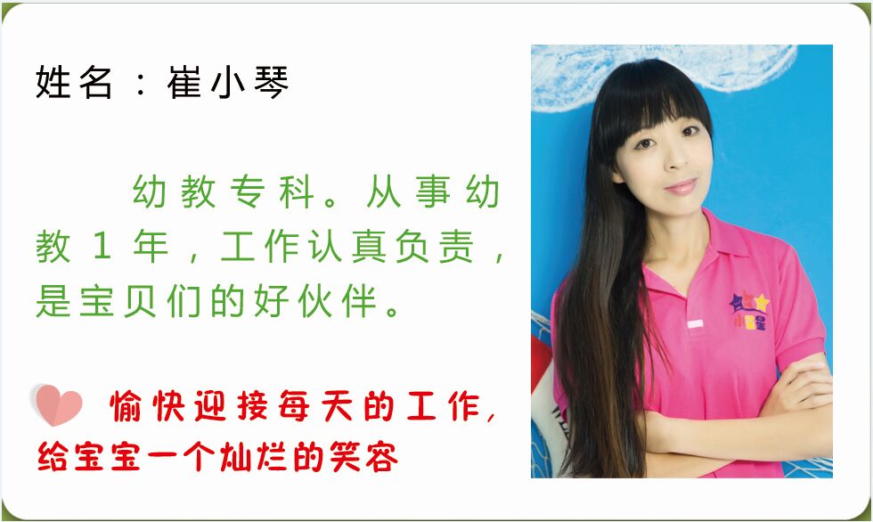 中心配有一支责任心强、经验丰富的师资队伍,保育人员都经过培训上岗,教师持证上岗率达100%。让孩子每一天都快乐而有价值!